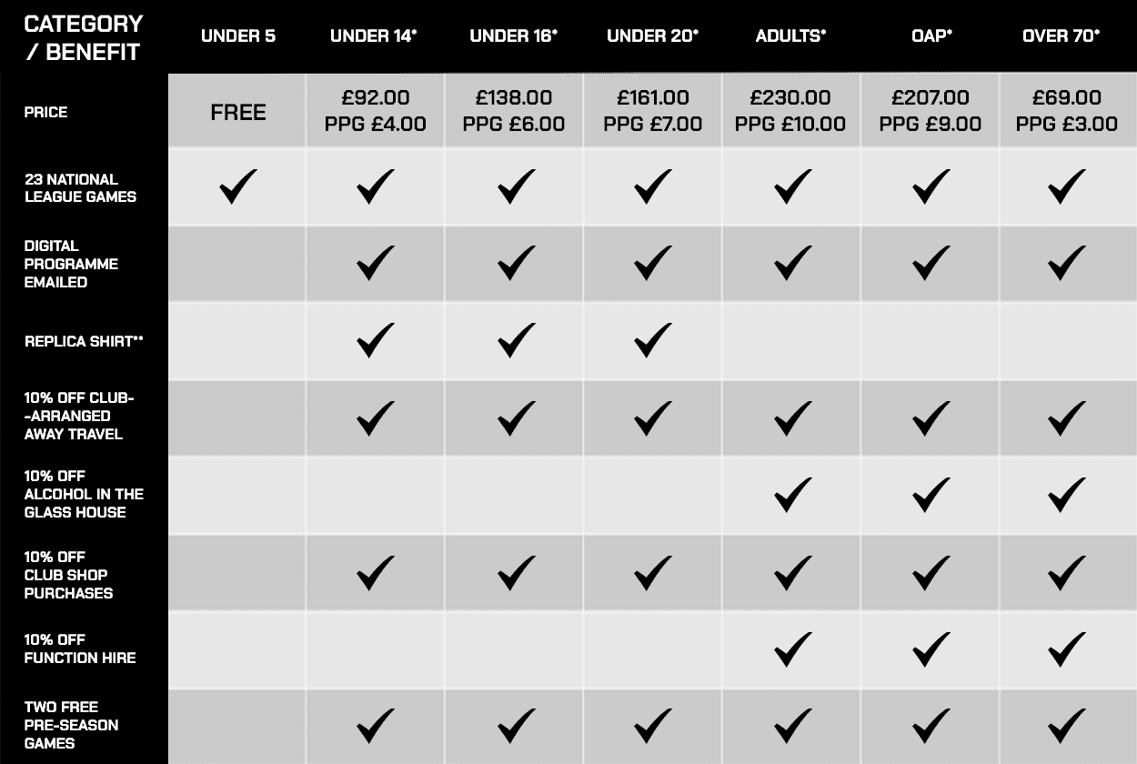 Adult, OAP and Over 70 Season Ticket benefits will include 10% off your match day pint or drink in the Glass House and 10% off Function Hire, subject to availability. Furthermore, Under 14 through to Over 70 Season tickets will come with 10% off Club-arrange away travel.