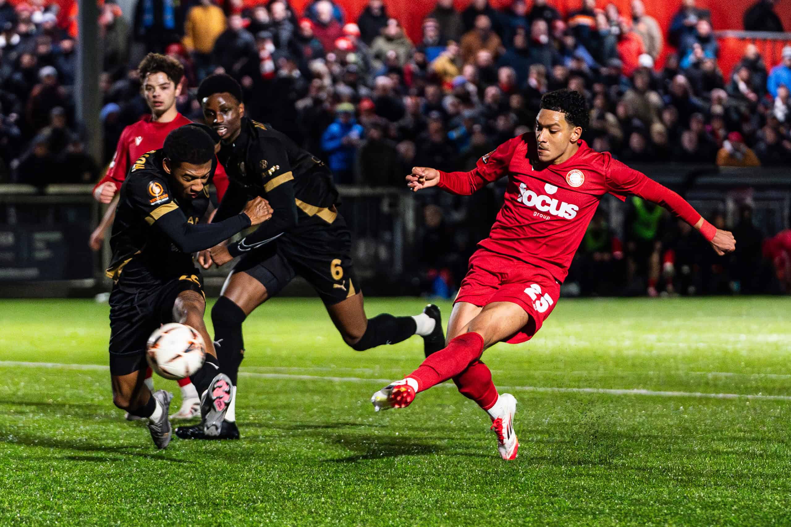 At the start of the second half, Wood sat back and defended their lead. This worked until the 56th minute when the hosts got their equaliser. It was a delightful cross from Ruben Carvalho that found the head of Colbran, whose powerful header beat Ashmore in the Wood goal. Four minutes later, Colbran had another shot, though this time it was blocked by Femi Ilesanmi. Faal fired wide just two minutes later.