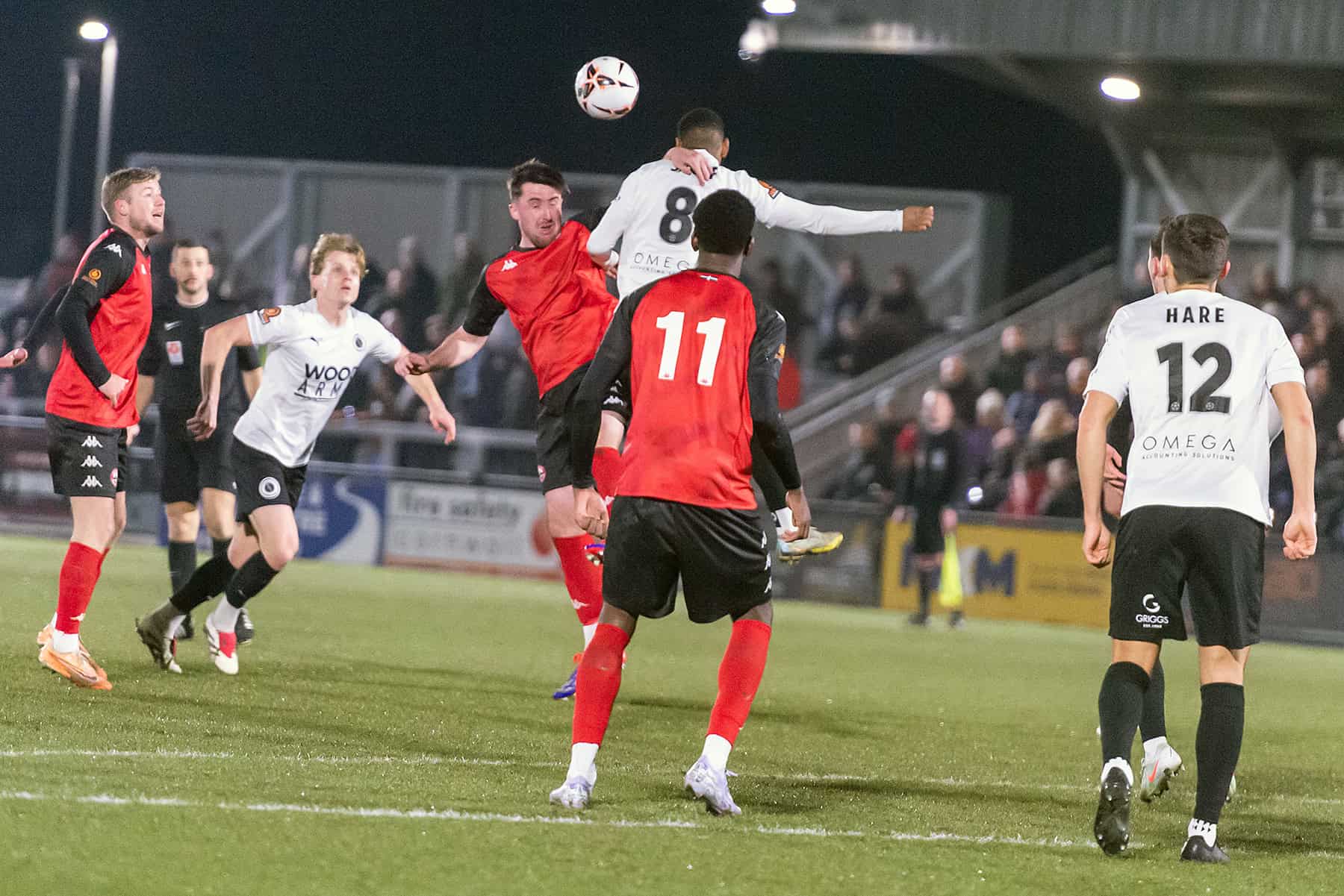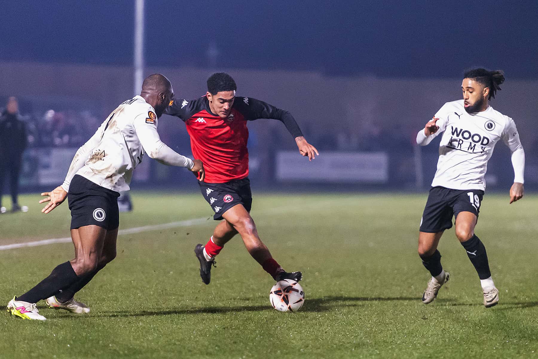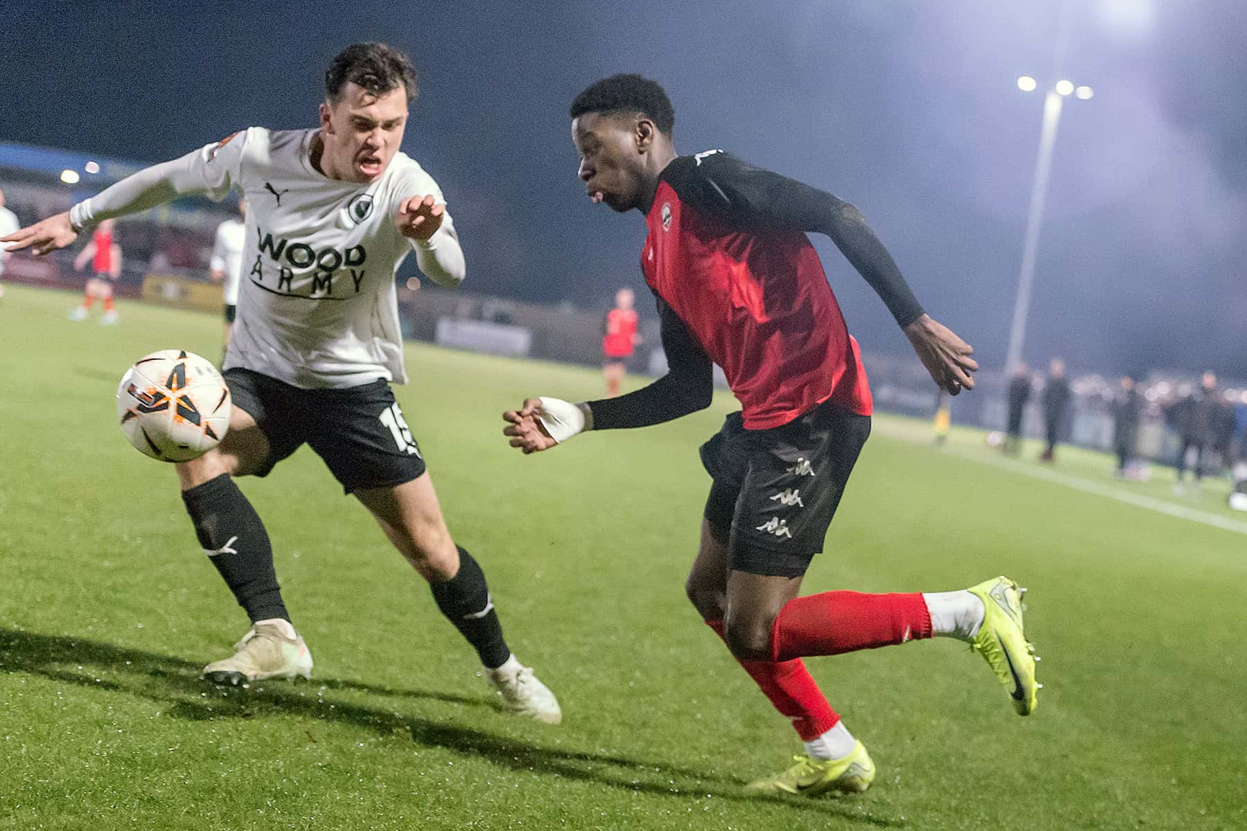 The next period of the game was dominated by the hosts, and the long throws of Christian Oxlade-Chamberlain were a concern to the Wood defence. Wood got better as the half wore on, and on 26 minutes, Mo Sagaf shot from distance straight into the arms of Lavercombe. On 41 minutes, an inch-perfect Josh Hare cross was headed wide by Femi Ilesanmi. Two minutes later, Matt Rush missed a gilt-edged chance by shooting narrowly wide from close range.