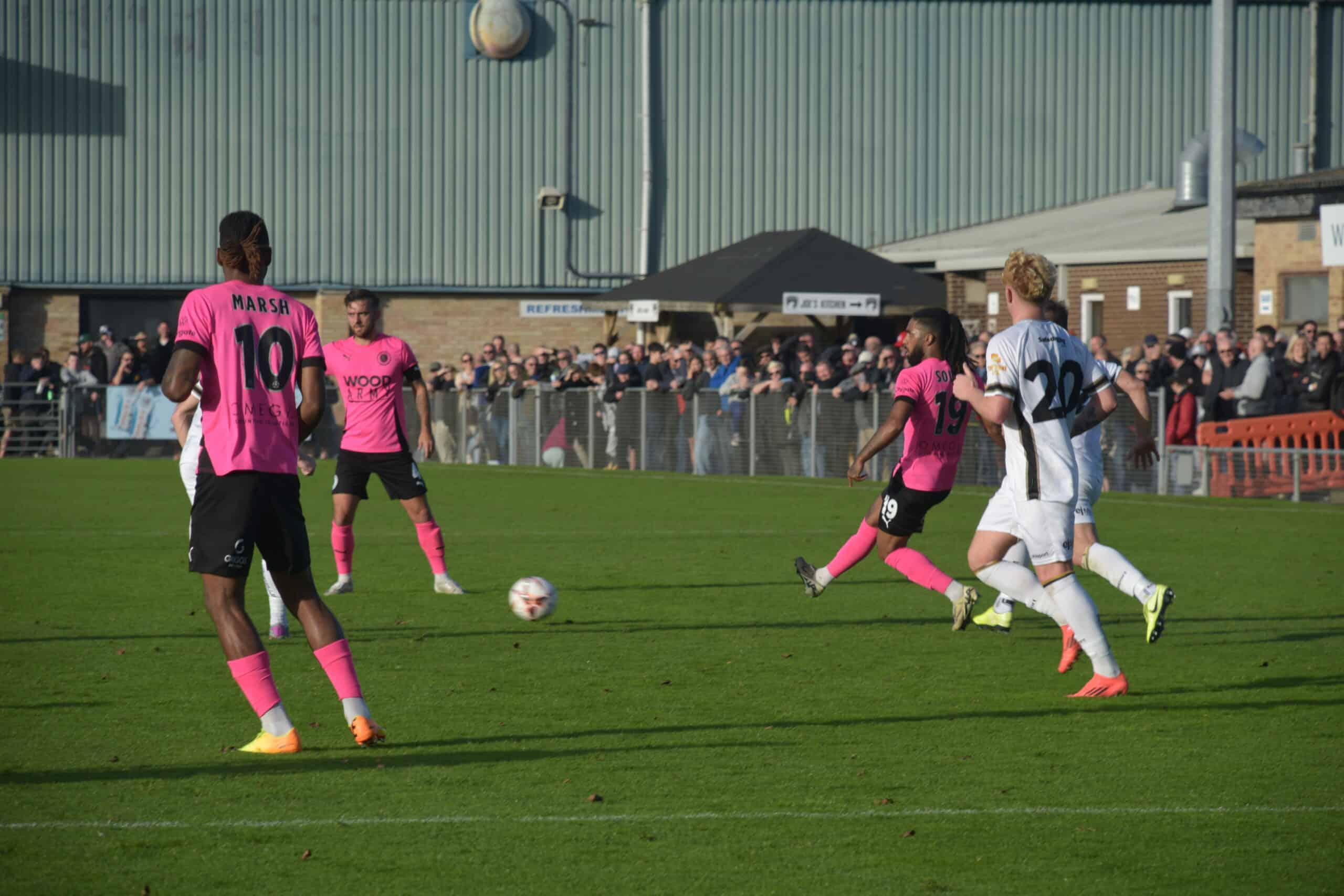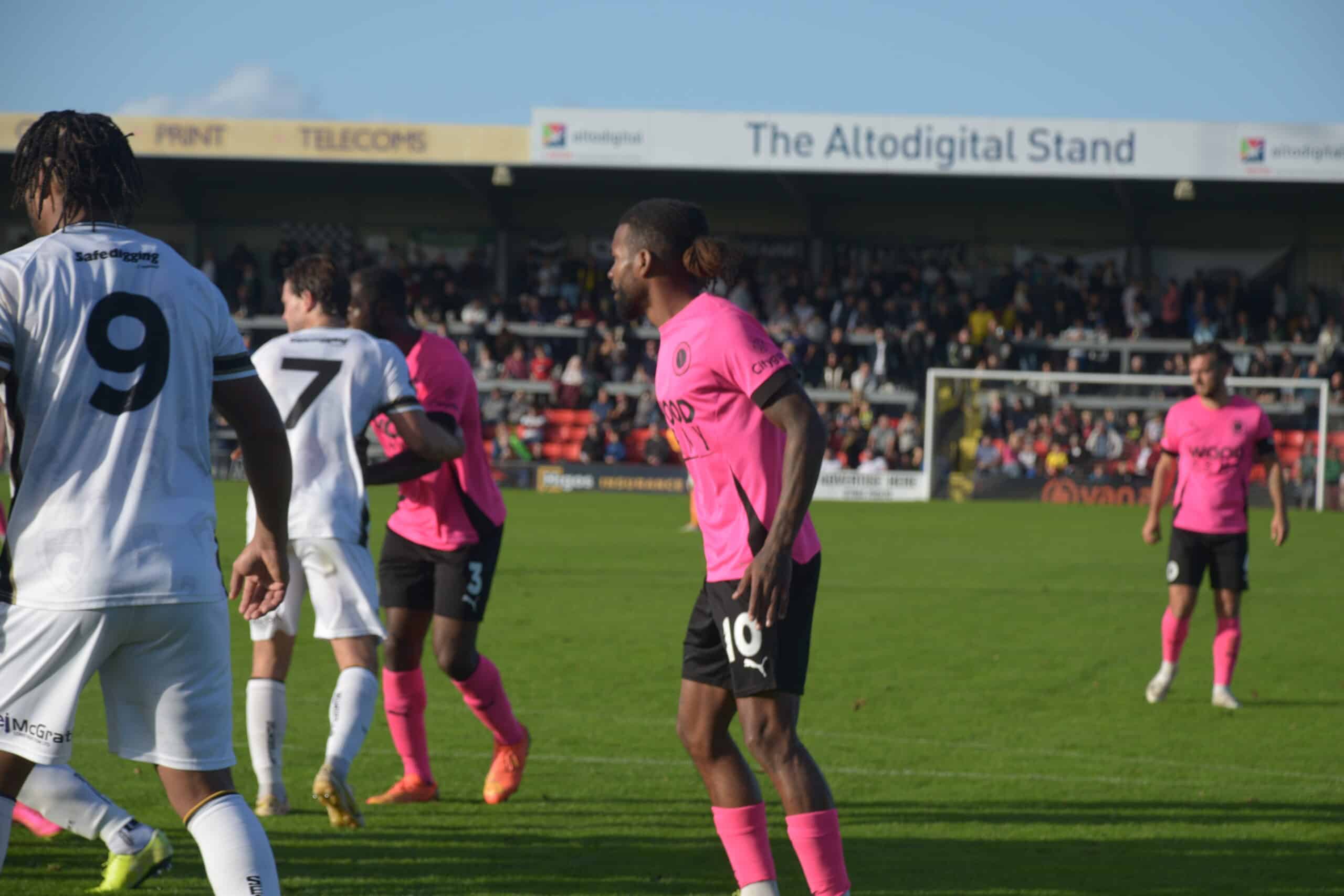 It was a scrappy first half overall, where Boreham Wood were often second-best. The hosts nearly took the lead after six minutes when a mix-up between Nathan Ashmore and Charlie O’Connell enabled Reuben Reid to pounce, but he was unable to get a clean connection with the ball. Two minutes later, Junior Dixon had a shot deflected that nearly deceived Seagulls’ keeper Max Harris, but the Cheltenham Town loanee did well to gather the ball.