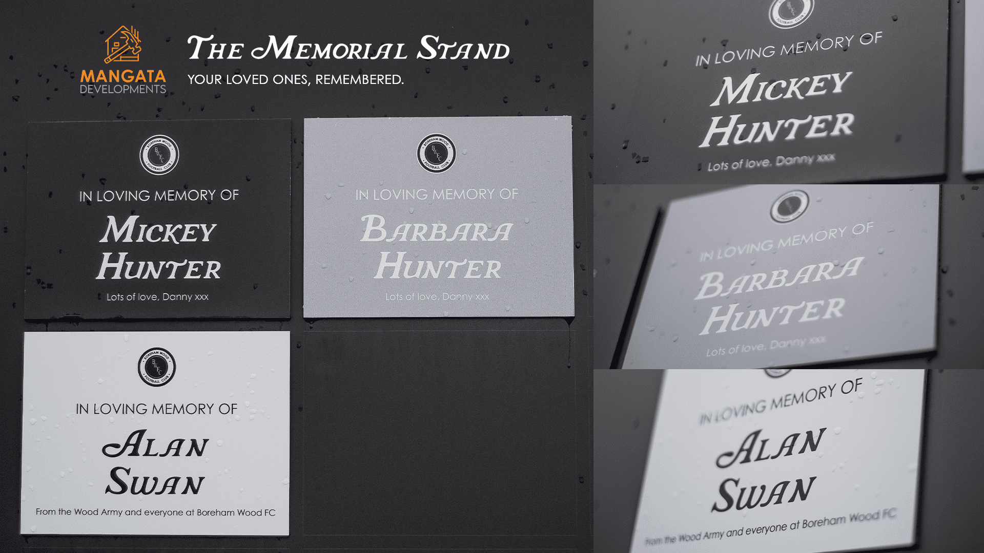 There is still plenty of opportunity for you to remember your loved ones in this way. By purchasing a personalised memorial plaque in one or more of designs above, your tribute will be permanently displayed on the Memorial Stand, creating a lasting legacy and ensuring your loved one’s connection to Boreham Wood Football Club endures for generations to come.