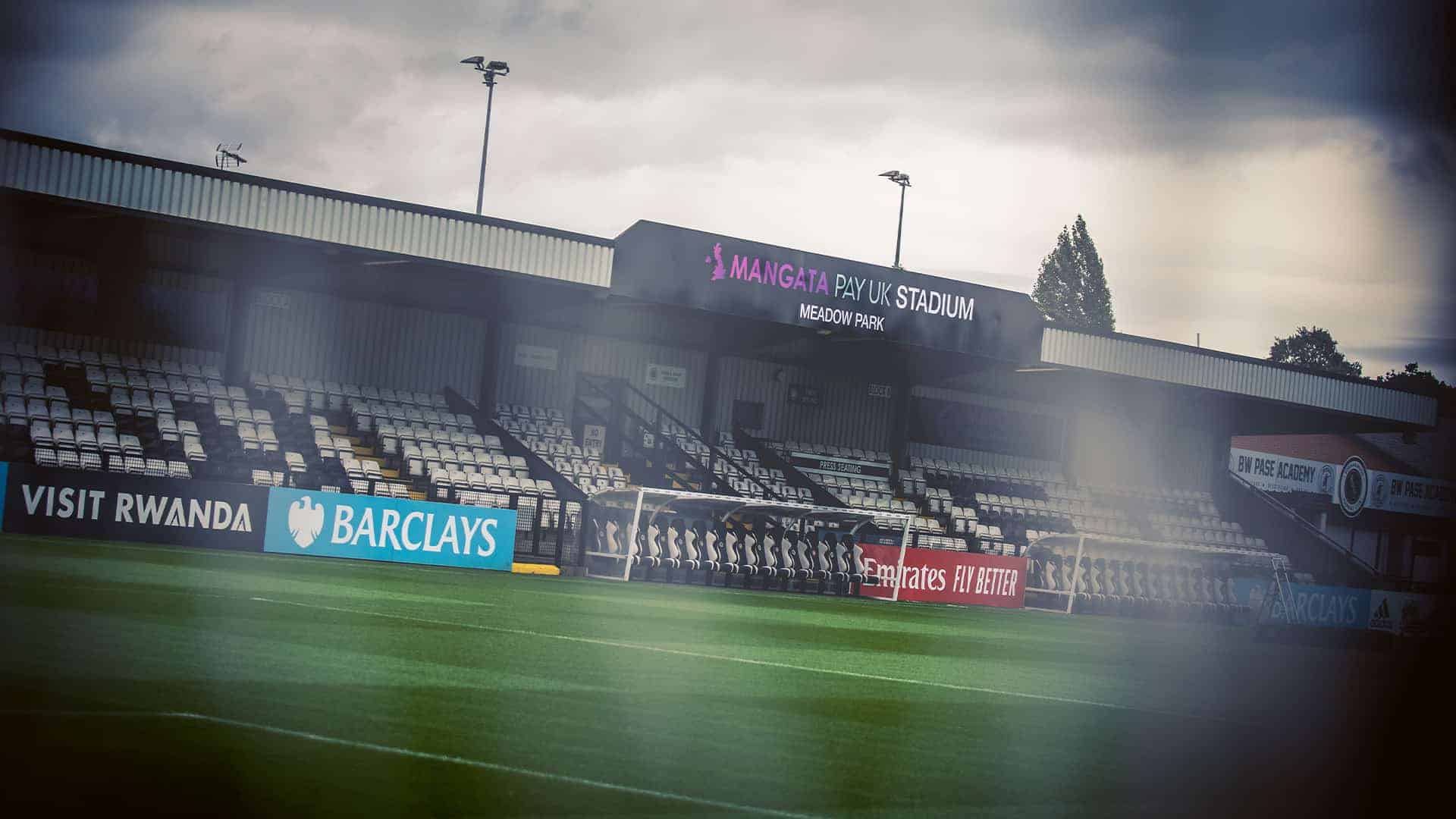 Visiting supporters to the Mangata Pay UK Stadium Meadow Park will be located at the South End of the ground, accessible via turnstiles 9 & 10, where there is an allocation for up to 1,250 spectators; this allocation is made up on 359 covered seats in our West Stand (operating on a first come first serve basis), whilst the remainder is made up of uncovered standing along the South and South East terraces.